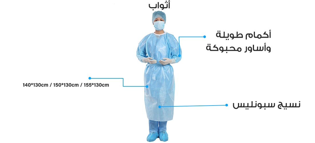ما في ذلك أغطية والمعاطف الجراحية ، ومنتجات حماية الرأس والوجه ، من أجل حماية كلاً من المرضى والعاملين في القطاع الصحي من إنتشار الميكروبات و العدوي.